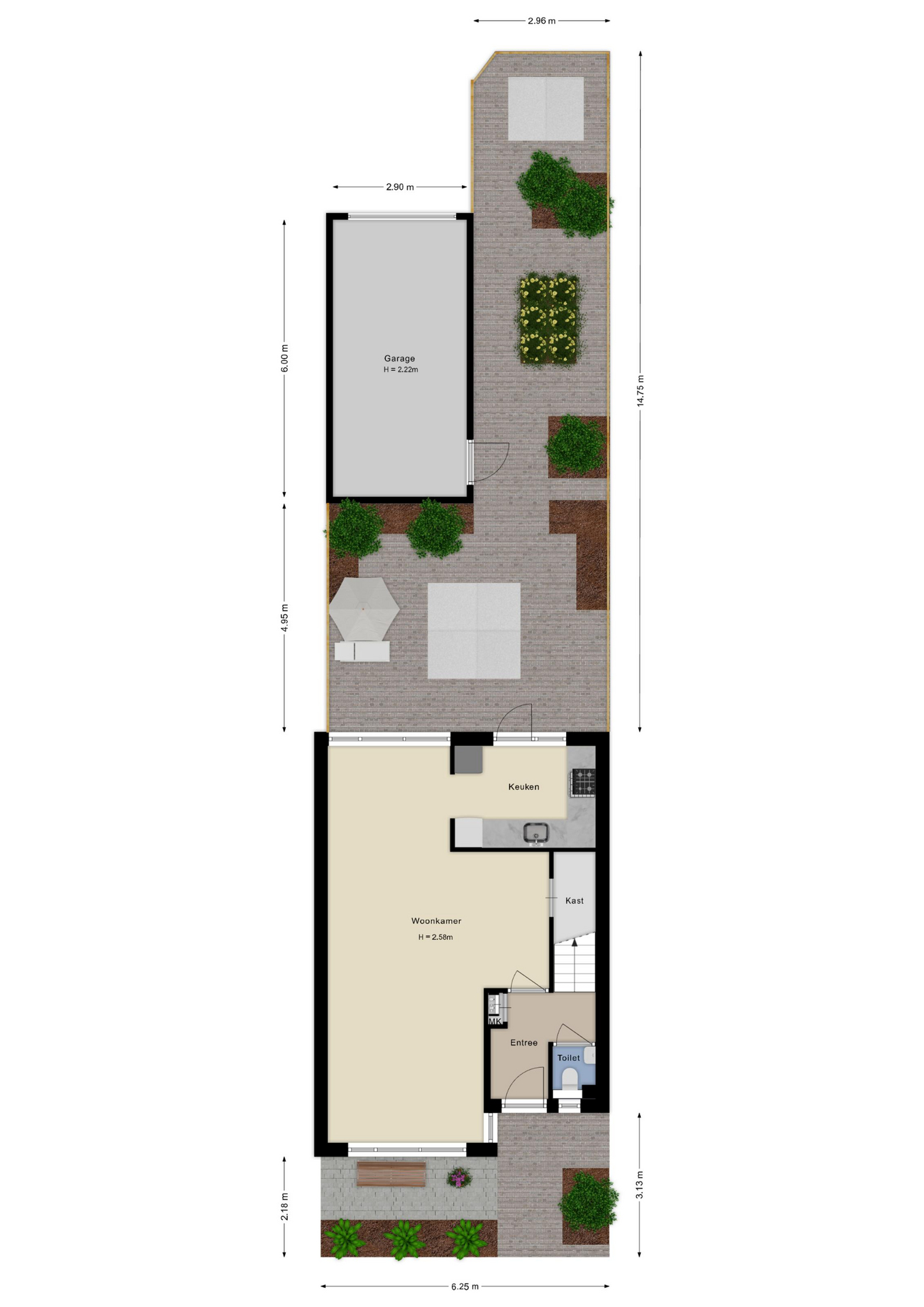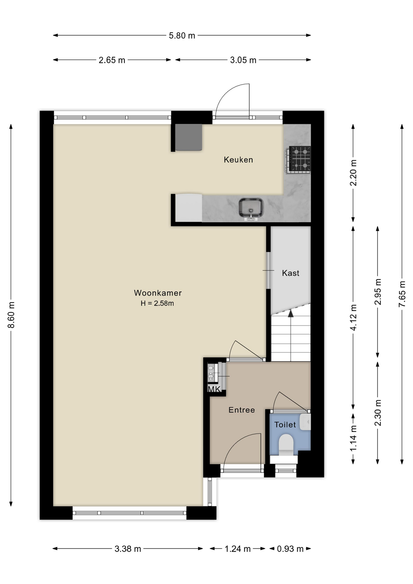 Met de voordeur achter je dicht, stap je een hal binnen waar daglicht en ruimte elkaar ontmoeten. Hier tref je het toilet; functioneel en netjes afgewerkt. De meterkast en de trapopgang vind je eveneens in deze uitnodigende entree. De woonkamer vloeit natuurlijk over in de keuken en biedt toegang tot de zonnige achtertuin. De open keuken fungeert als het hart van het huis, waar zowel snelle lunches als uitgebreide diners moeiteloos worden bereid.