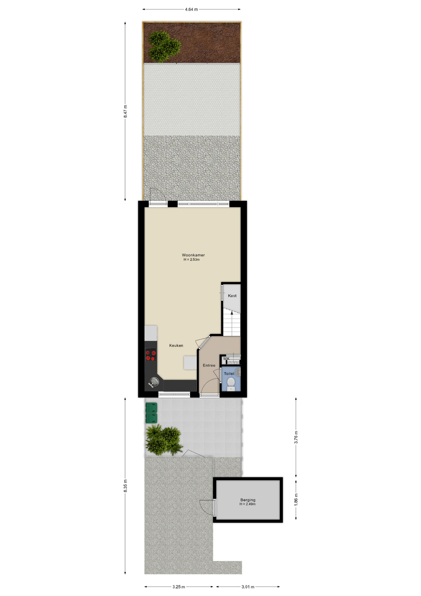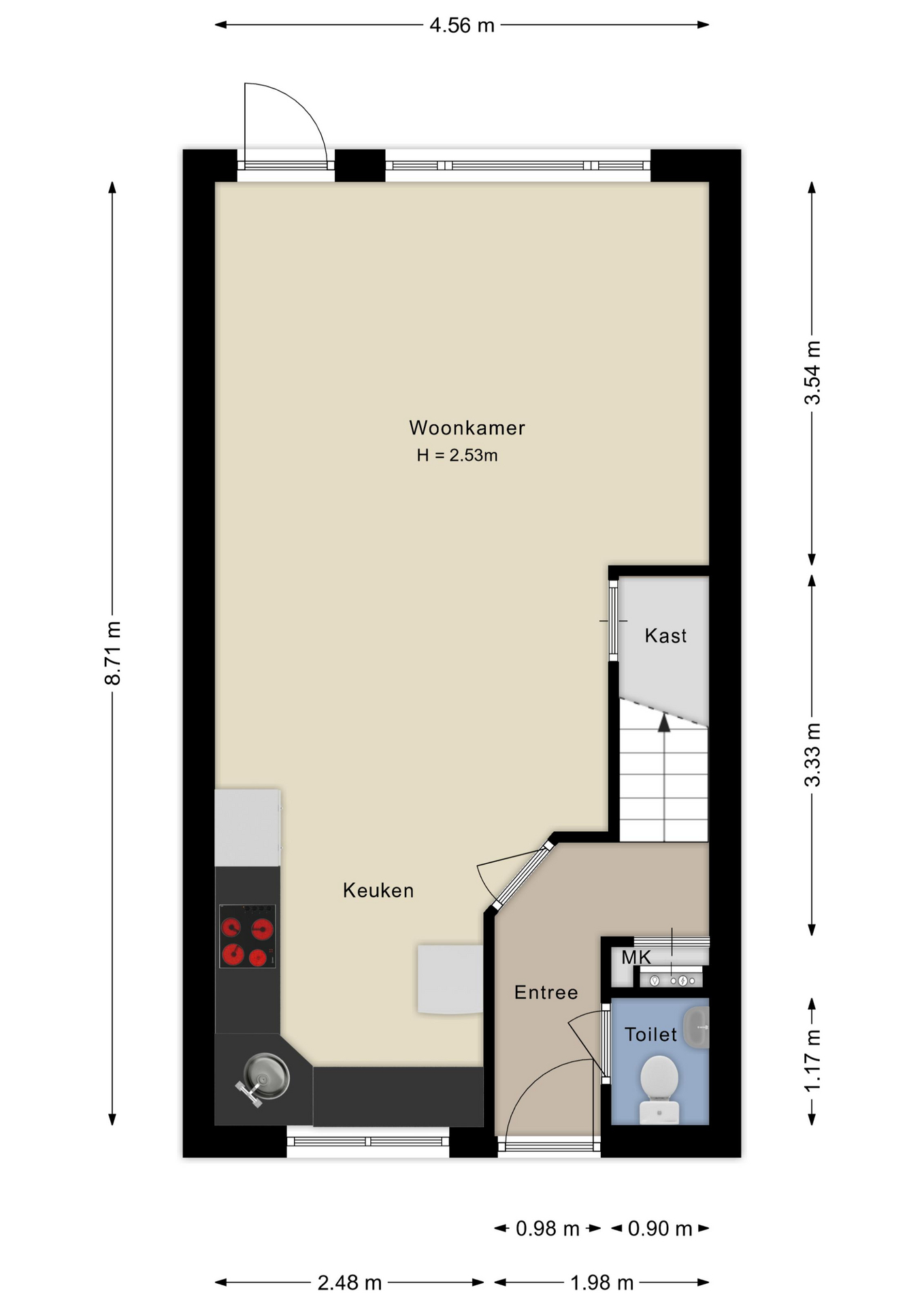 Bij binnenkomst in de hal vind je direct het praktische toilet en de meterkast. Vanuit hier stap je de woonkamer binnen die baadt in het licht dankzij de grote ramen die uitkijken op de tuin. De open keuken staat in verbinding met de woonkamer, waardoor je tijdens het koken contact behoudt met familie of gasten.
