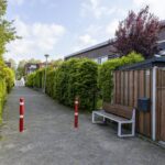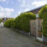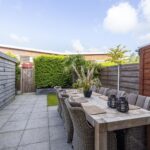 De voortuin is de hoofdtuin en is fraai aangelegd met bestrating, vaste beplanting en een stuk gras. Je kunt hier een fijn tuinmeubel plaatsen en heerlijk buiten eten. De schuifpui in de keuken grenst meteen aan het terras, waardoor je binnen en buiten op zomerse dagen perfect in elkaar kunt laten overlopen. Er is hier ook een houten berging, waar de fietsen en tuingereedschap neergezet kan worden.