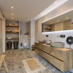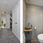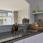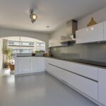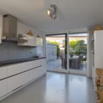 Je betreedt de woning in een ruime hal: deze is voorzien van ruimte voor een garderobe, de trapopgang, een handige trapkast en het toilet met fontein. De hal geeft toegang tot de bijkeuken en de woonkamer. Met drie treden naar beneden stap je de woonkamer in. De schuifpui aan de achterzijde van de woning geeft meteen mooi uitzicht op het water en zorgt voor fijn lichtinval. De woonkamer is strak afgewerkt en er ligt een prachtige gietvloer. Er is voldoende ruimte voor een comfortabele zithoek en ook een grote eethoek kun je hier nog met gemak kwijt. De keuken is modern ingericht met een strak keukenmeubel in een L-opstelling. Hij is uitgerust met een kookplaat, een afzuigkap, een oven, een magnetron en een vaatwasser.