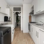 De keuken is functioneel ingericht en voorzien van een oven, 4-pits gaskookplaat, afzuigkap, koel-/vriescombinatie en veel kastruimte.