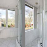 De badkamer is praktisch ingericht en voorzien van een douchecabine met thermostaatkraan, wastafel, ventilatie en daglichttoetreding.