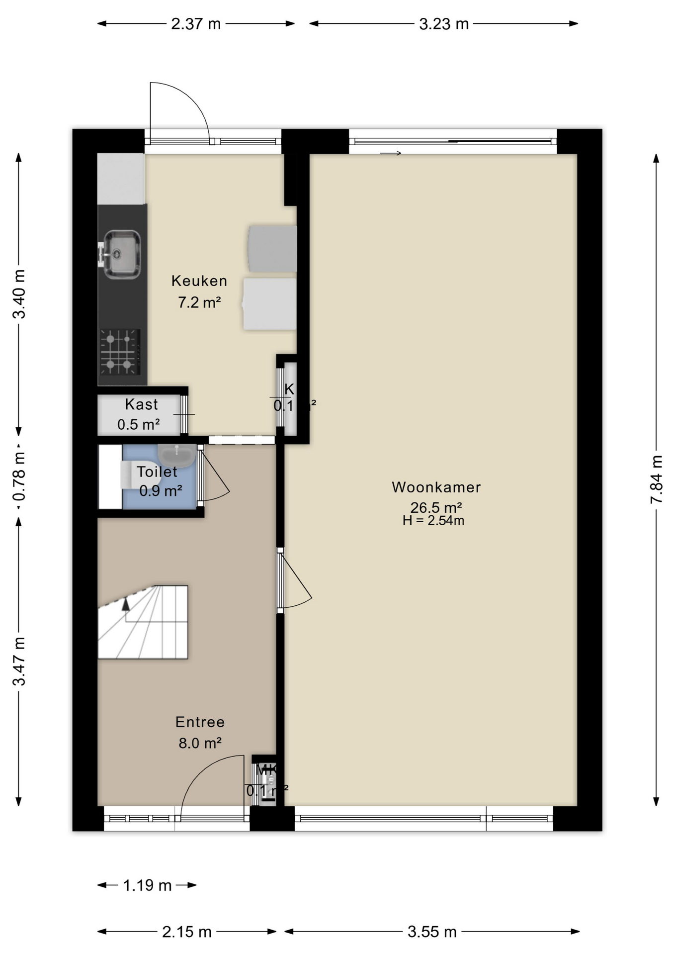 Via de ruime voortuin bereik je de entree van de woning. De hal is licht en ruim opgezet en beschikt over een meterkast/inbouwkast en een volledig betegelde toiletruimte.