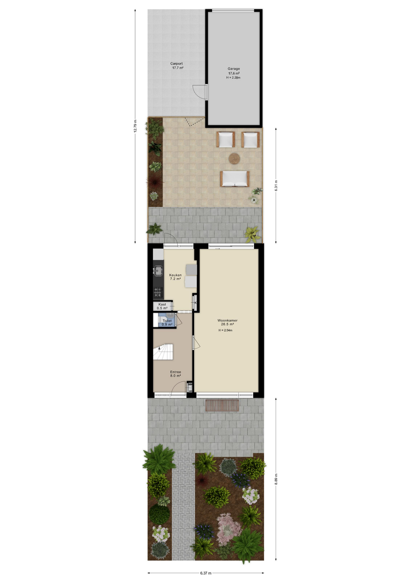 De zonnige achtertuin (ca. 6,52 x 6,33 m) ligt op het oosten en is verzorgd aangelegd met sierbestrating, een wateraansluiting en een praktische achterom via de carport. Vanuit hier heb je toegang tot de garage (ca. 6,22 x 2,86 m), voorzien van elektra en een garagedeur.