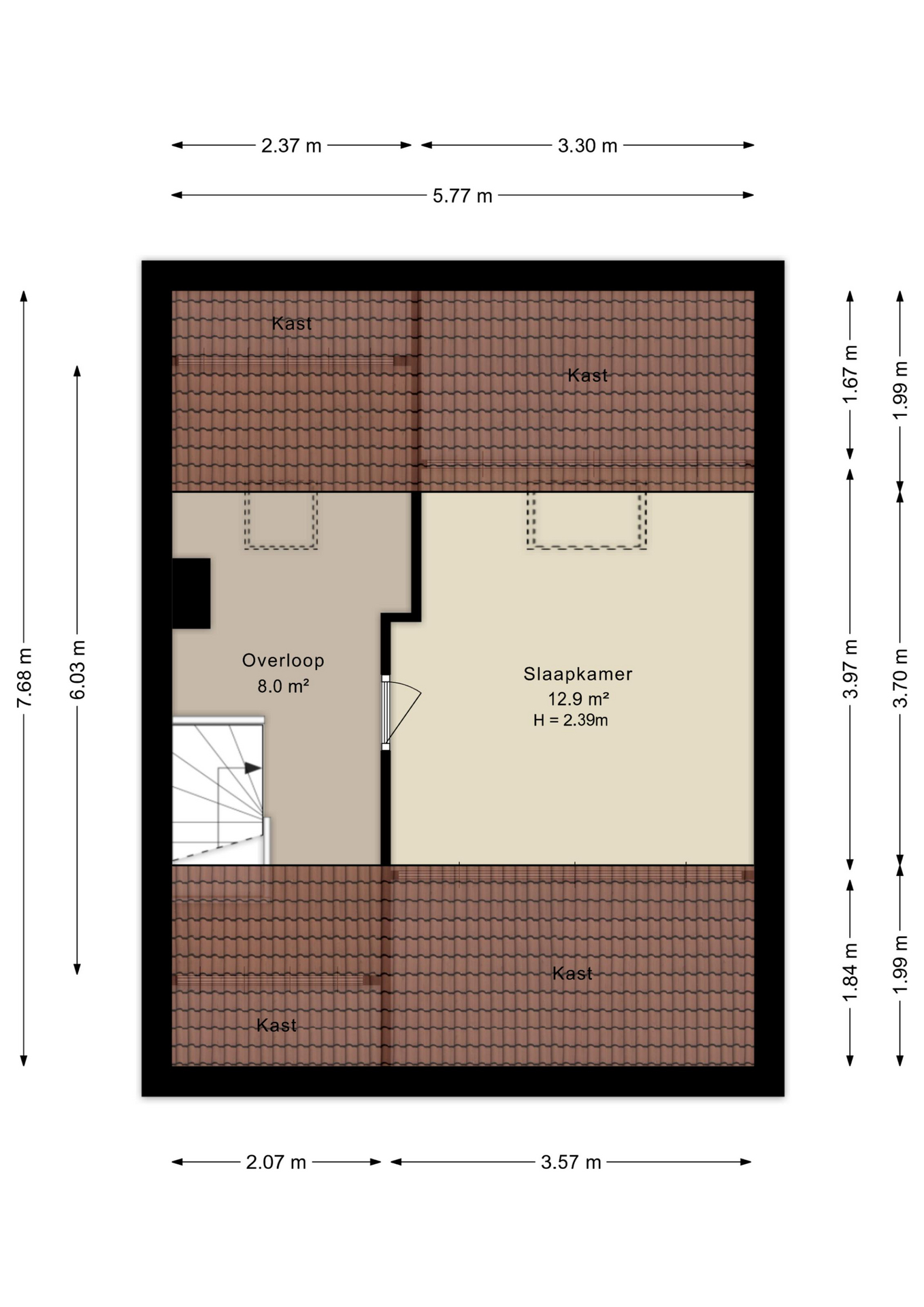 De zolderverdieping is bereikbaar via een vaste trap en biedt een ruime voorzolder met bergruimte en aansluiting voor de wasmachine. Daarnaast vind je hier een gezellige zolderkamer met dakraam en extra bergruimte.