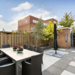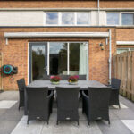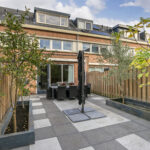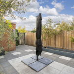 The back garden is beautifully landscaped with a large terrace and a brick storage shed, perfect for bikes or gardening tools. Facing west, the garden enjoys plenty of sunshine — ideal for long summer days. Prefer a bit of shade? The large awning offers the perfect solution. A tap is also available in the garden.