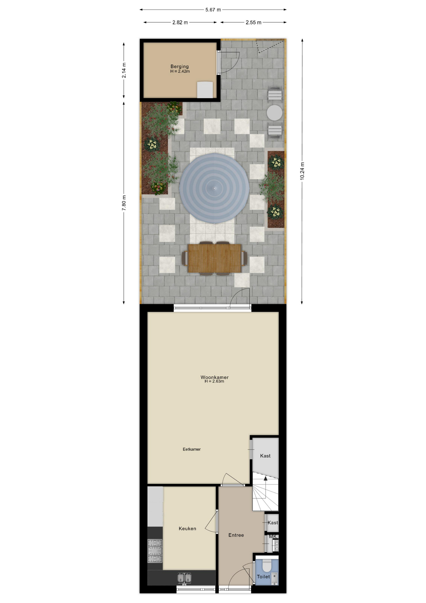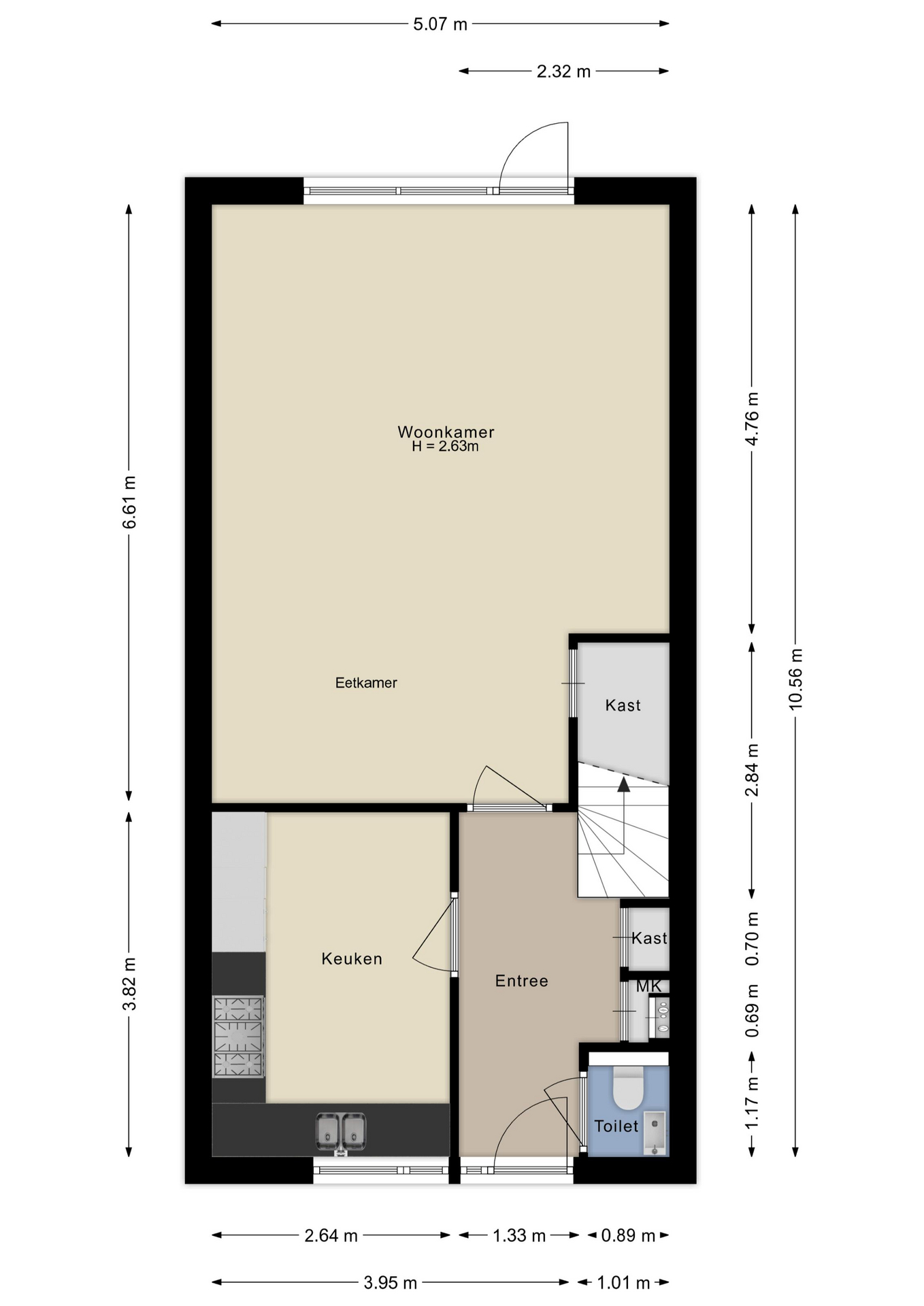 Via de nette entree kom je binnen in de ruime hal met toilet en trapopgang. De lichte en uitgebouwde woonkamer met grote raampartijen en openslaande deuren naar de tuin voelt direct uitnodigend aan. Er is volop ruimte voor een gezellige eet- en zithoek. Aan de voorzijde bevindt zich de keuken, voorzien van inbouwapparatuur en voldoende werkruimte — ideaal voor kookliefhebbers. De gehele begane grond (m.u.v. het toilet) is voorzien van vloerverwarming. Onder de trap vind je een handige bergkast voor extra opbergruimte.