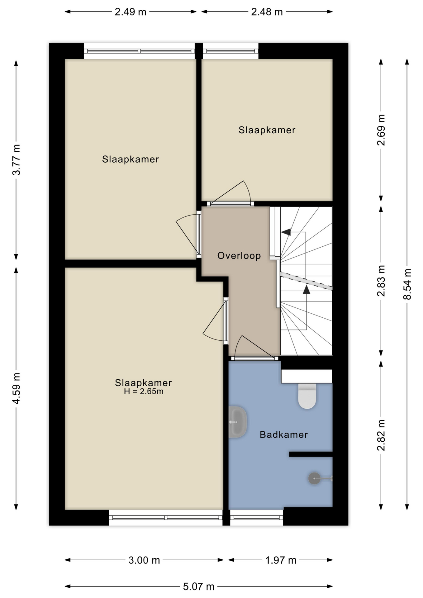 Op de eerste verdieping bevinden zich drie slaapkamers van goed formaat, allemaal licht en praktisch ingedeeld. De badkamer is modern en compleet, met een douche, wastafel en toilet.