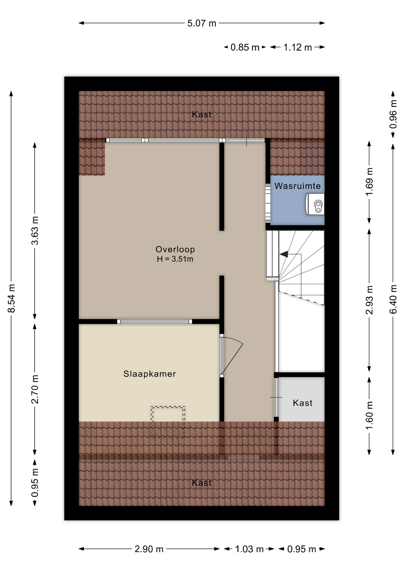 De tweede verdieping is verrassend ruim dankzij de grote dakkapel aan de achterzijde. Hier vind je nog een vierde slaapkamer, een wasruimte en extra bergruimte achter de knieschotten. Deze verdieping is ideaal als werk-, logeer- of tienerkamer.