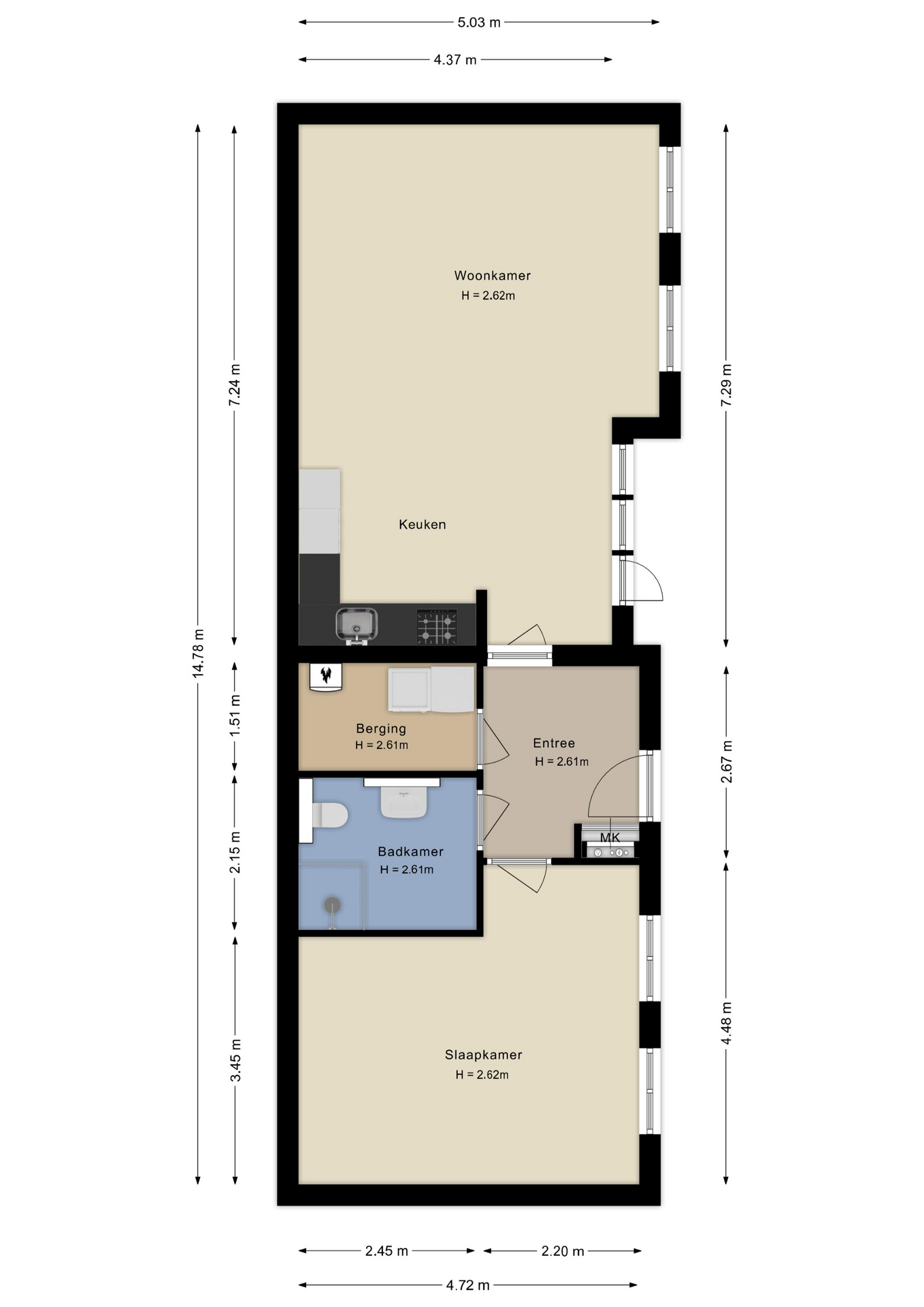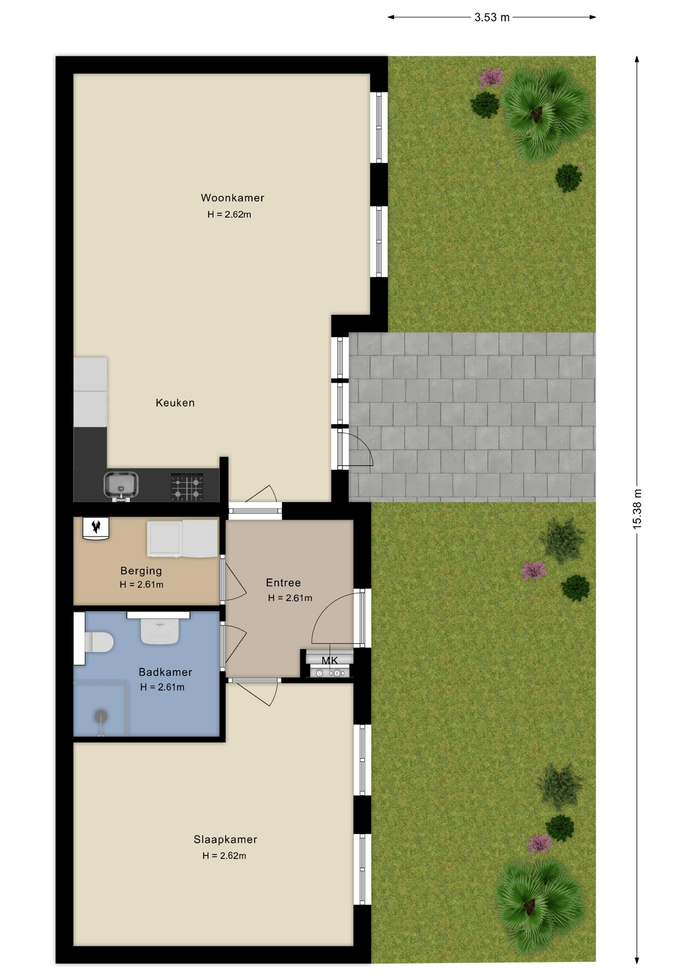 De L-vormige open keuken, uitgerust met inbouwapparatuur, is ideaal voor iedereen die van koken houdt. De ruime slaapkamer biedt volop plek voor een tweepersoonsbed en zelfs een thuiswerkplek. De moderne badkamer is praktisch ingericht met een inloopdouche, toilet en wastafel. In de berging vindt je de aansluitingen voor wasmachine en droger.