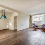 De L-vormige woonkamer is met circa 29m2 ruim bemeten en heerlijk licht door de grote raampartijen aan de voorzijde en de tuinzijde. De woonkamer is voorzien van eikenhouten vloerdelen en gestucte wanden, vaste kast en deur naar de keuken.