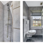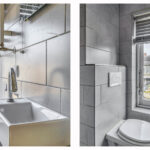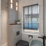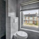 De compacte badkamer is volledig betegeld en voorzien van een inloopdouche, klein badmeubel met wastafel, hangend closet, designradiator en raampartij.
