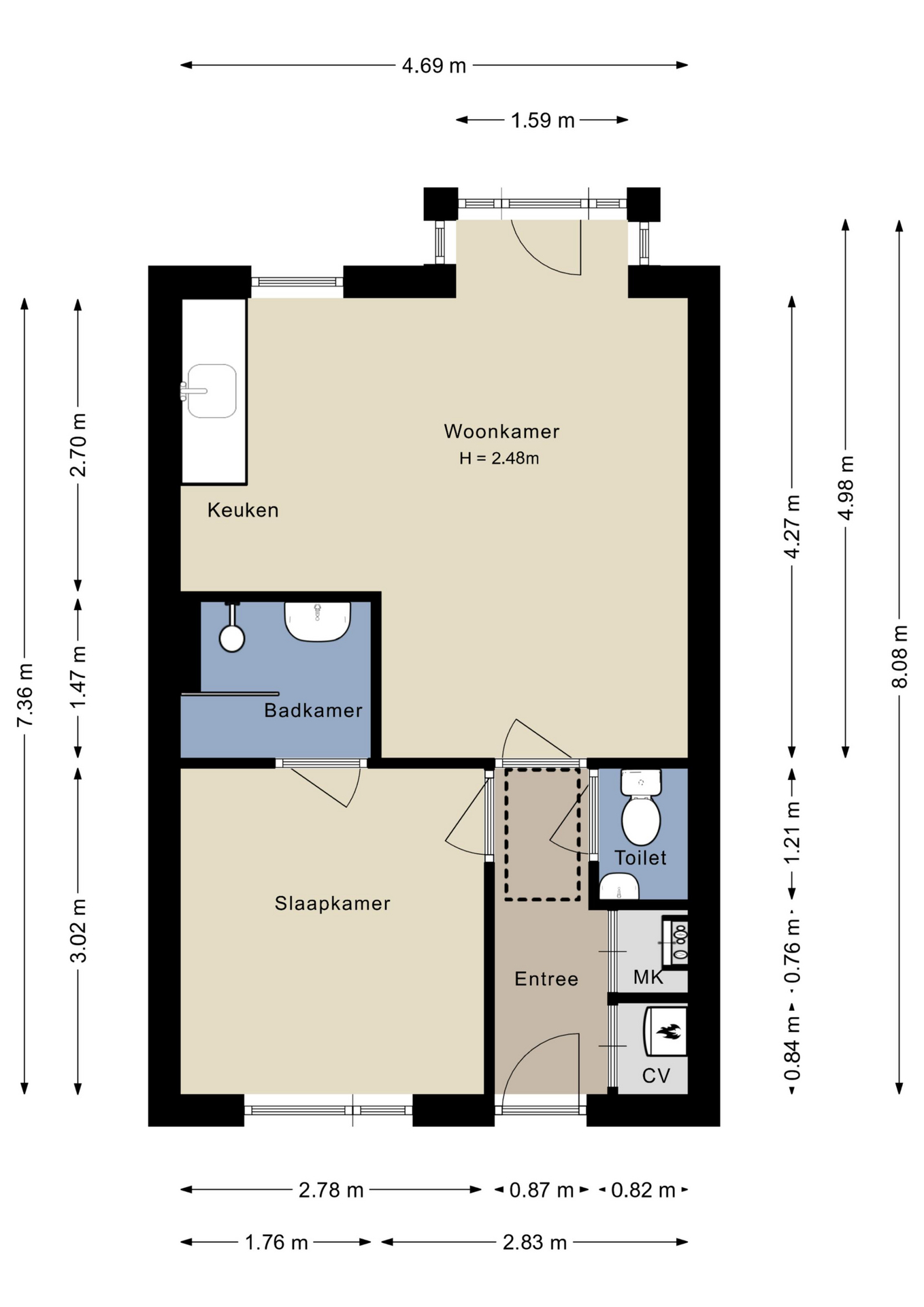 Entree, hal met meterkast, cv-kast en toilet met fontein. Sfeervolle woonkamer met Frans balkon. Open keuken met eenvoudig keukenblok. Ruime slaapkamer. Geheel betegelde badkamer met douche, wastafel en aansluiting voor de wasmachine.