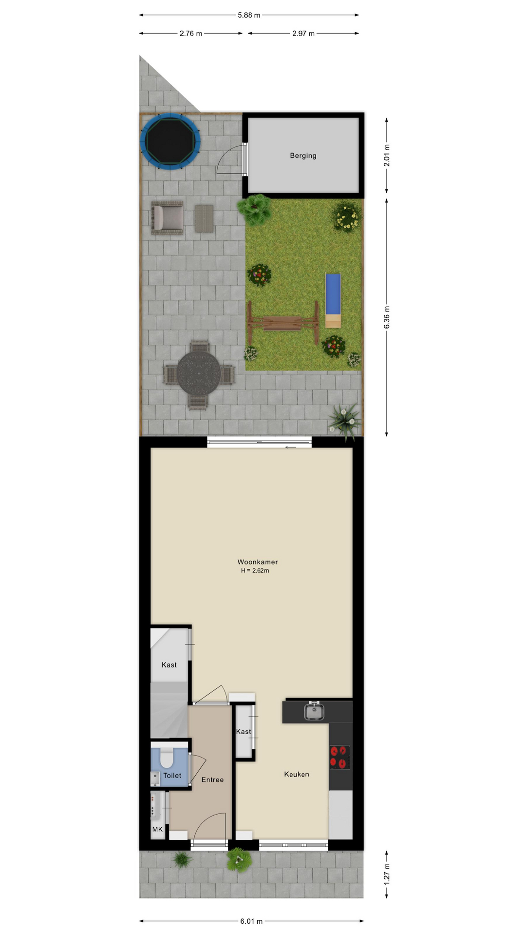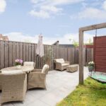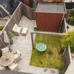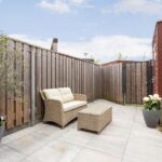 De diepe achtertuin op het westen is verzorgd aangelegd met sierbestrating, een gazon, een houten berging en een handige achterom. Je eigen parkeerplaats bevindt zich direct achter de tuin – altijd plek voor je auto!