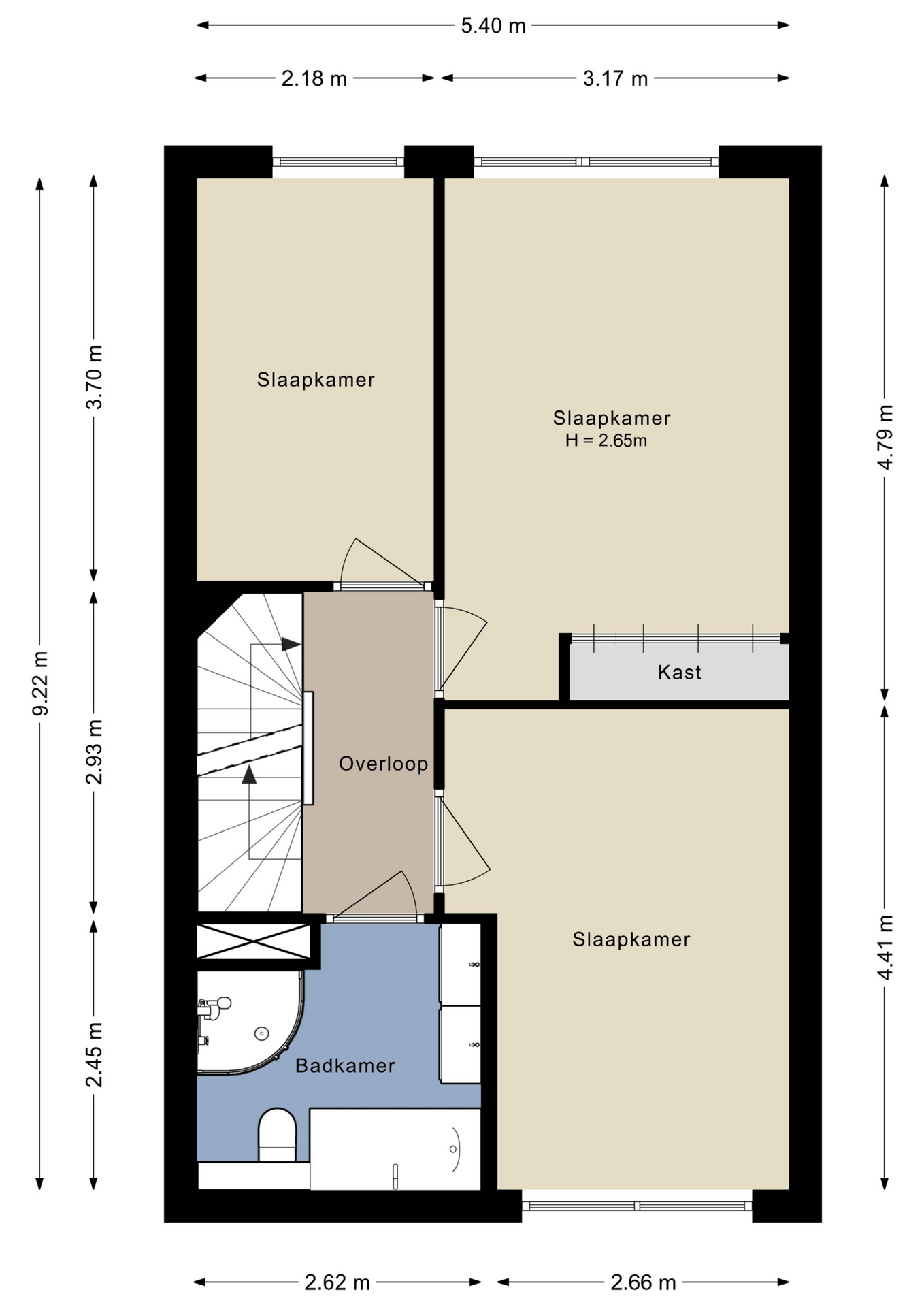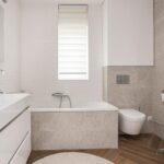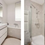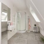 Via de overloop bereik je drie ruime slaapkamers, stuk voor stuk keurig afgewerkt met hoge plinten en grote raampartijen. De moderne badkamer is volledig betegeld en beschikt over een ligbad, een separate douche, wastafelmeubel met spiegel en tweede toilet. Ook deze verdieping is geheel voorzien van vloerverwarming.