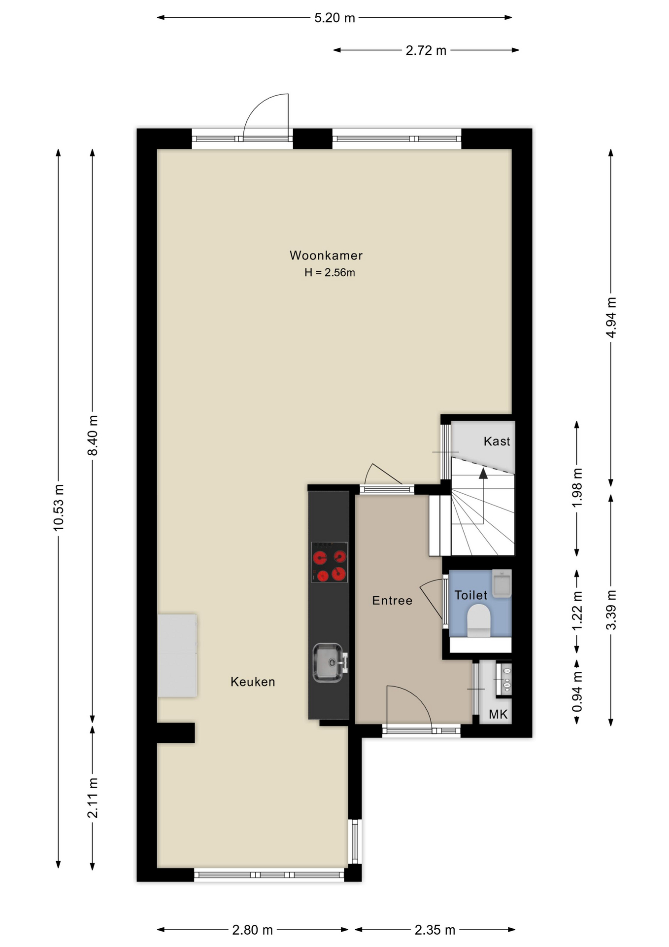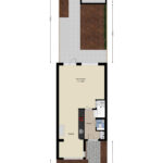De hal/entree biedt toegang tot de ruime woonkamer, het toilet, de meterkast en trapopgang naar de eerste verdieping. De woonkamer is ca. 25 m² groot en voorzien van een trapkast en een open inbouwkeuken met diverse apparatuur. Aansluitend bevindt zich de royale achtertuin op het noorden met achterom.