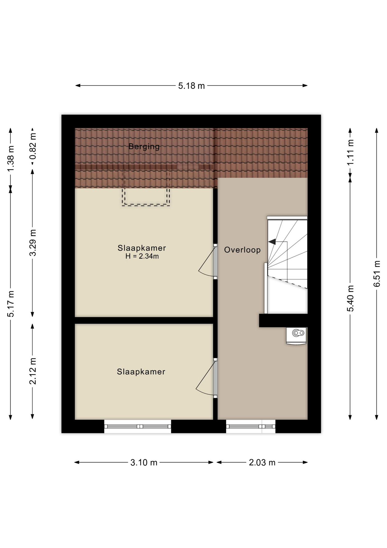 De overloop biedt toegang tot een tweetal goed bemeten slaapkamers, alsmede de badkamer met douche, toilet en wastafel.