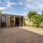 • Zonnige achtertuin op het zuiden met overkapping, berging en zonnescherm
