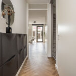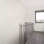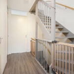Overloop met toegang tot drie slaapkamers, waaronder een ruime ouderslaapkamer aan de voorzijde. De badkamer is in 2025 volledig vernieuwd en biedt alle comfort van nu: een luxe regendouche, modern wastafelmeubel, hangtoilet, LED-spiegel, hoogwaardige tegels en stijlvol sanitair.