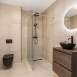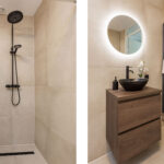 • Splinternieuwe badkamer (2025) met luxe regendouche, nieuw badkamermeubel, moderne tegels, hangtoilet, LED-verlichte spiegel, kraan & wasbak