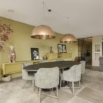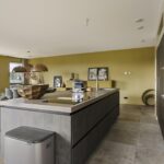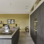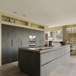 De keuken en het sanitair zijn van luxe kwaliteit en met zorg uitgekozen. De open royale keuken is voorzien van hoogwaardige inbouwapparatuur, waaronder een 4-pits inductiekookplaat, combi-oven, stoomoven, koelkast, vriezer met 3 lades, afwasmachine en quooker. De strakke mat bruine kasten en het grijs gemarmerde werkblad geven de keuken een moderne uitstraling.