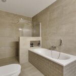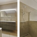 De luxe badkamer is uitgerust met een ligbad, grote inloopdouche met glazenwand en een wastafel met meubel en spiegel. Opvallende details zijn de fraaie, brede grijze tegels op de vloer en deels op de wand.