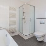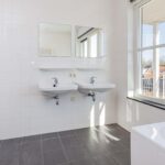 De ruime en lichte badkamer is modern uitgevoerd, volledig betegeld en zowel voorzien van een ligbad met thermostaatkraan als een douchecabine met thermostaatkraan alsmede twee wastafels met spiegels en een designradiator.