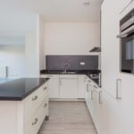 De woonkamer staat tevens in open verbinding met de keuken, die is voorzien van een L-vormig keukenblok met granieten aanrechtblad en Siemens inbouwapparatuur, te weten: koel-/vriescombinatie, gaskookplaat, combimagnetron, RVS-recirculatiekap en een vaatwasser, alsmede een klein werkeiland met granieten blad en bergruimte.