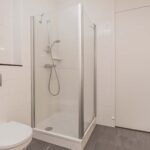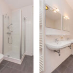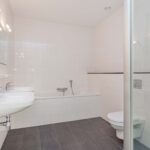 De ruime badkamer is modern uitgevoerd, volledig betegeld en zowel voorzien van een ligbad met thermostaatkraan als een douchecabine met thermostaatkraan alsmede twee wastafels met spiegels, hangend closet en een designradiator.