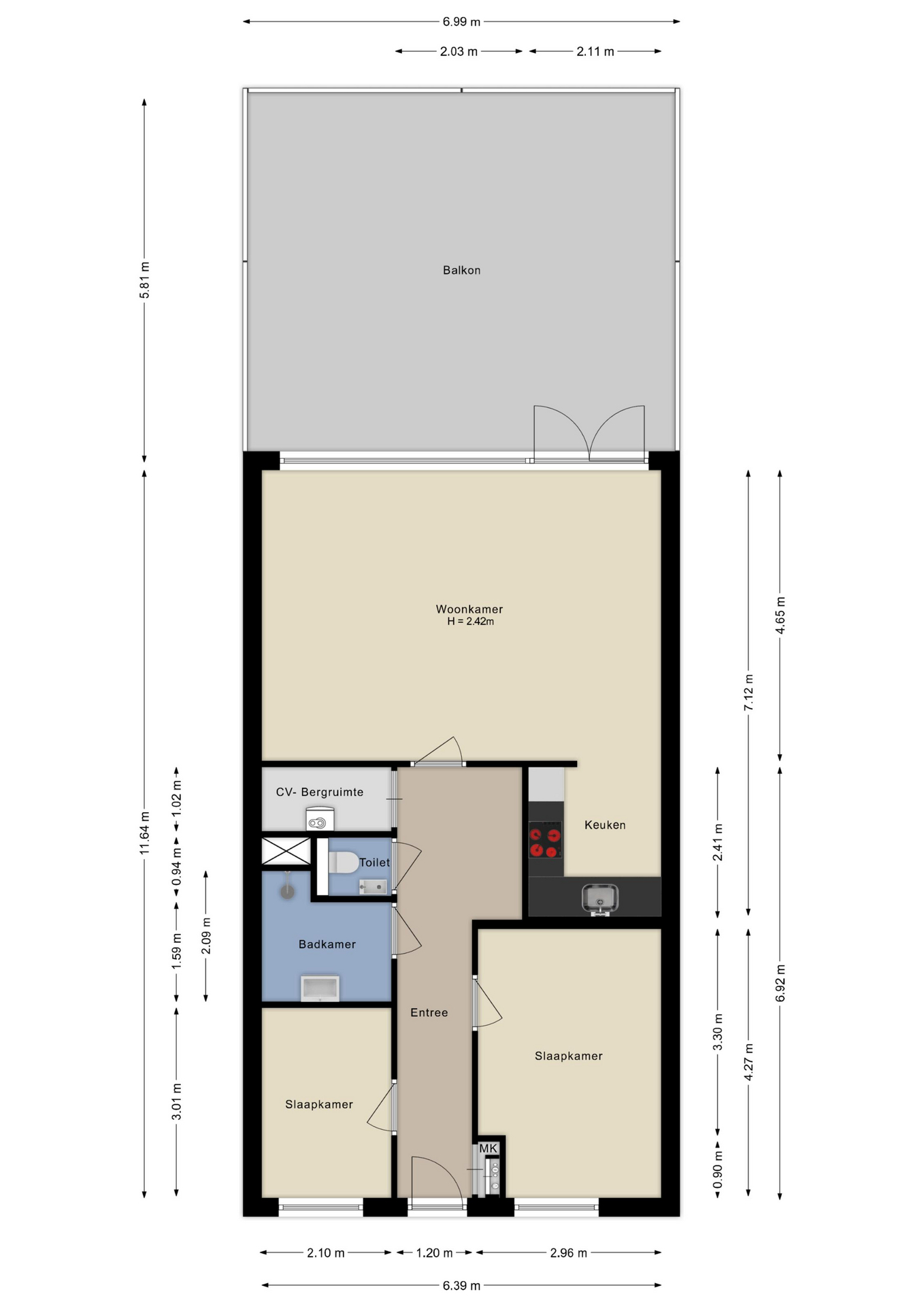 De entree van de woning bevindt zich in de hal, die toegang biedt tot de verschillende vertrekken. De woonkamer is ruim en licht en staat in directe verbinding met de halfopen keuken. De moderne keuken is praktisch ingericht in een hoekopstelling en voorzien van diverse inbouwapparatuur, waaronder een inductiekookplaat, afzuigkap, koelkast met vriesvak, vaatwasser en combimagnetron. Vanuit de woonkamer is het royale dakterras op het zuiden bereikbaar, waar je de hele dag kunt genieten van de zon. De woning beschikt over twee slaapkamers. De hoofdslaapkamer is ruim opgezet, terwijl de tweede slaapkamer uitstekend dienst kan doen als werk- of logeerkamer. De badkamer is functioneel ingericht en voorzien van een douche, wastafel en aansluiting voor de wasmachine. Het separate toilet beschikt over een fonteintje. Daarnaast is er een inpandige berging aanwezig met opstelplaats voor de technische installaties, waaronder de cv-ketel.