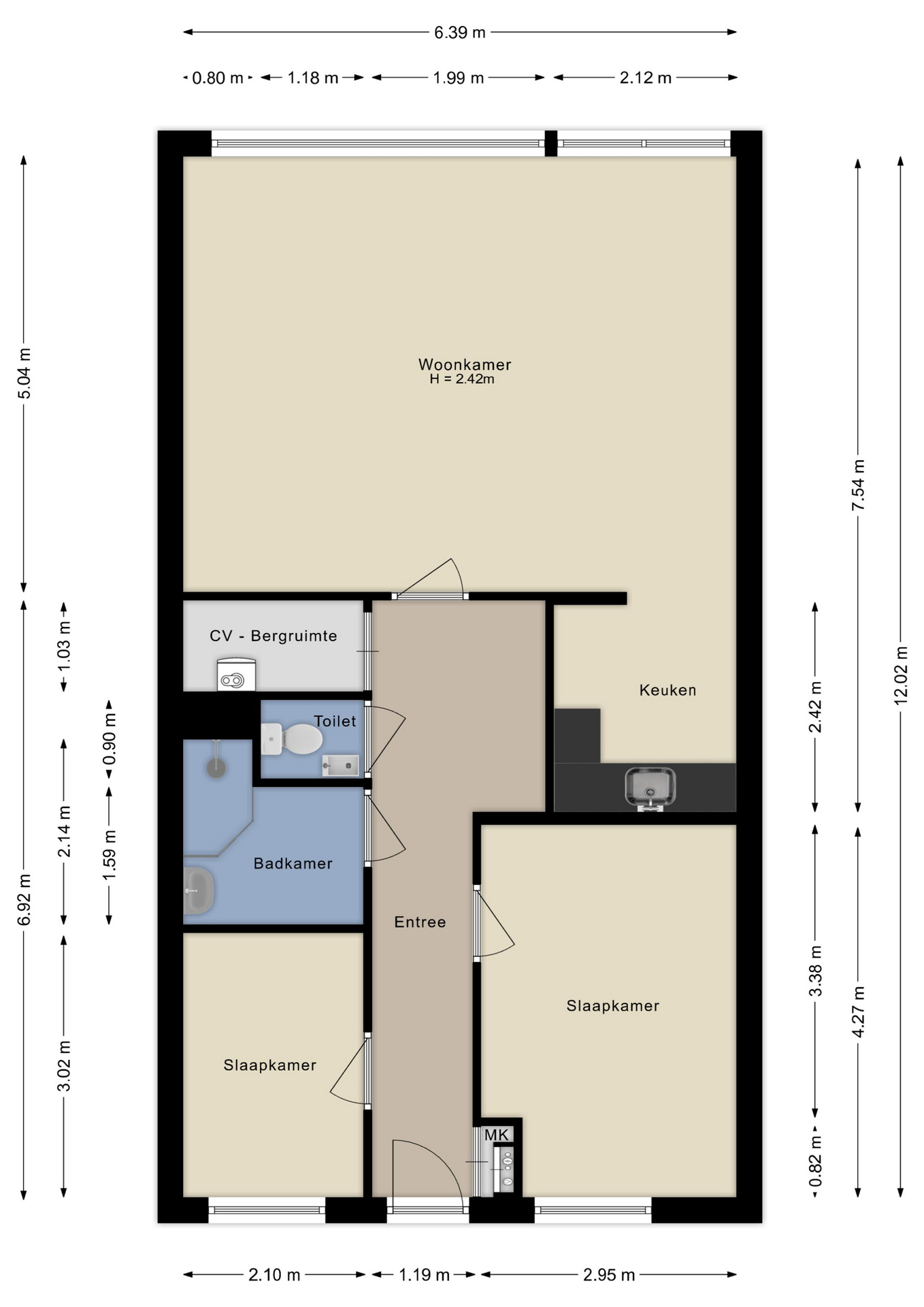 Aan de galerijzijde van het appartement bevinden zich twee slaapkamers.