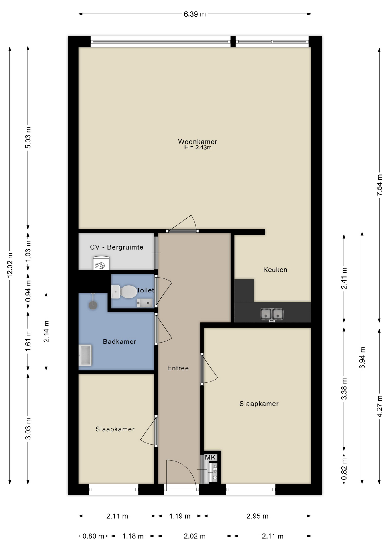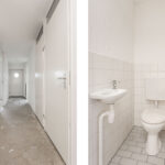 Aan de galerijzijde van het appartement bevinden zich twee slaapkamers, beide van goed formaat. De badkamer is uitgerust met een wastafelmeubel, douche en aansluiting voor de wasmachine. Het separate toilet is voorzien van een fonteintje. Verder is er een inpandige berging met de cv-ketel (Remeha Avanta, ca. 2014) en de mechanische ventilatie-unit.