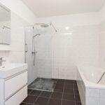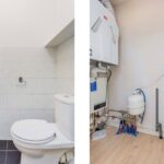 De badkamer is voorzien van een ligbad, separate douchecabine, wastafel en is grotendeels betegeld. Aan de overzijde van de badkamer is de witgoedruimte met opstelling CV (2017 / eigendom), WTW-installatie en is ideaal als voorraad -/ bergkast. Het toilet bevindt zich ernaast en is voorzien van een fonteintje.