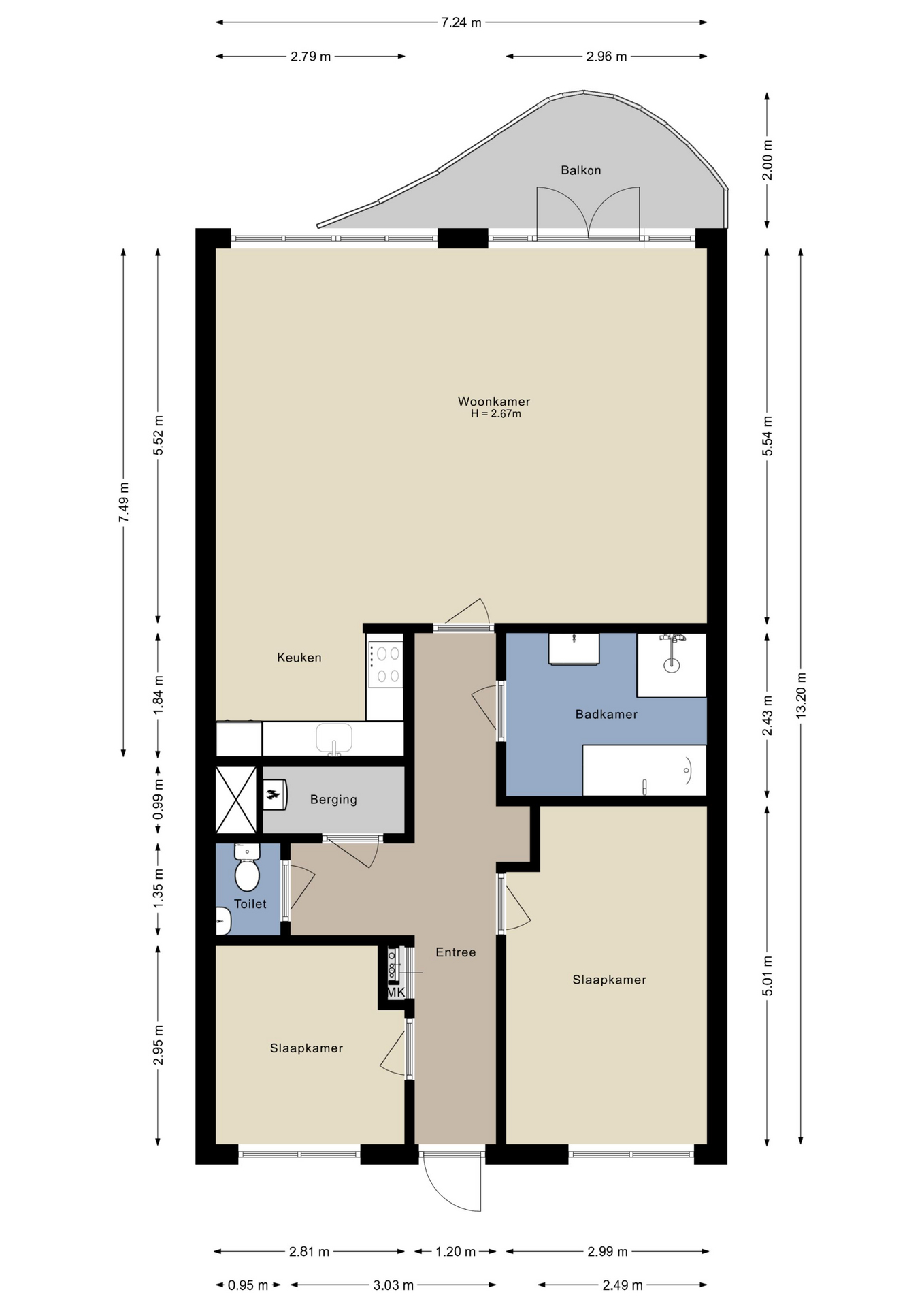 Entree, meterkast, toilet, video-intercom, hal vanwaar ieder vertrek te bereiken is. Er bevinden zich een tweetal slaapkamers in het appartement die allebei aan de galerij zijde zijn gesitueerd.