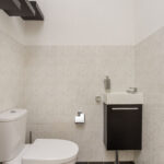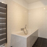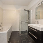 De badkamer is voorzien van een ligbad, separate douchecabine, wastafel en is grotendeels betegeld. Aan de overzijde van de badkamer is de witgoedruimte met opstelling CV (2017 / eigendom), WTW-installatie en is ideaal als voorraad -/ bergkast. Het toilet bevindt zich ernaast en is voorzien van een fonteintje.