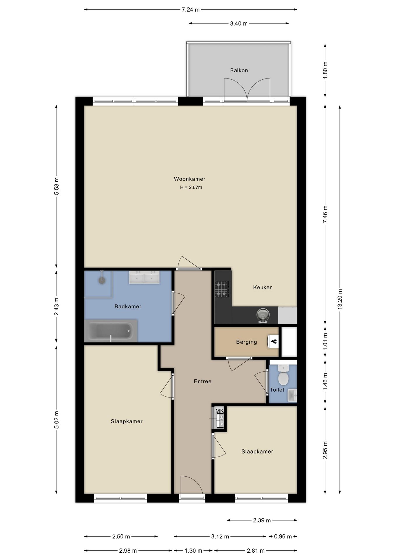 Entree, meterkast, toilet, video-intercom, hal vanwaar ieder vertrek te bereiken is. Er bevinden zich een tweetal slaapkamers in het appartement die allebei aan de galerij zijde zijn gesitueerd.