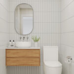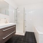 De badkamer is voorzien van een ligbad, separate douchecabine, wastafel en is grotendeels betegeld. Aan de overzijde van de badkamer is de witgoedruimte met opstelling CV (2017 / eigendom), WTW-installatie en is ideaal als voorraad -/ bergkast. Het toilet bevindt zich ernaast en is voorzien van een fonteintje.