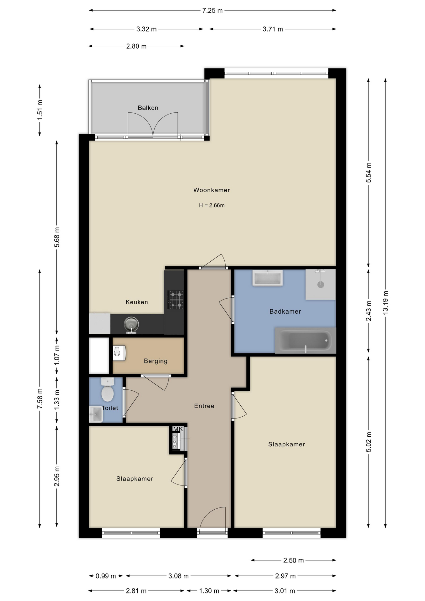 Entree, meterkast, toilet, video-intercom, hal vanwaar ieder vertrek te bereiken is. Er bevinden zich een tweetal slaapkamers in het appartement die allebei aan de galerij zijde zijn gesitueerd.