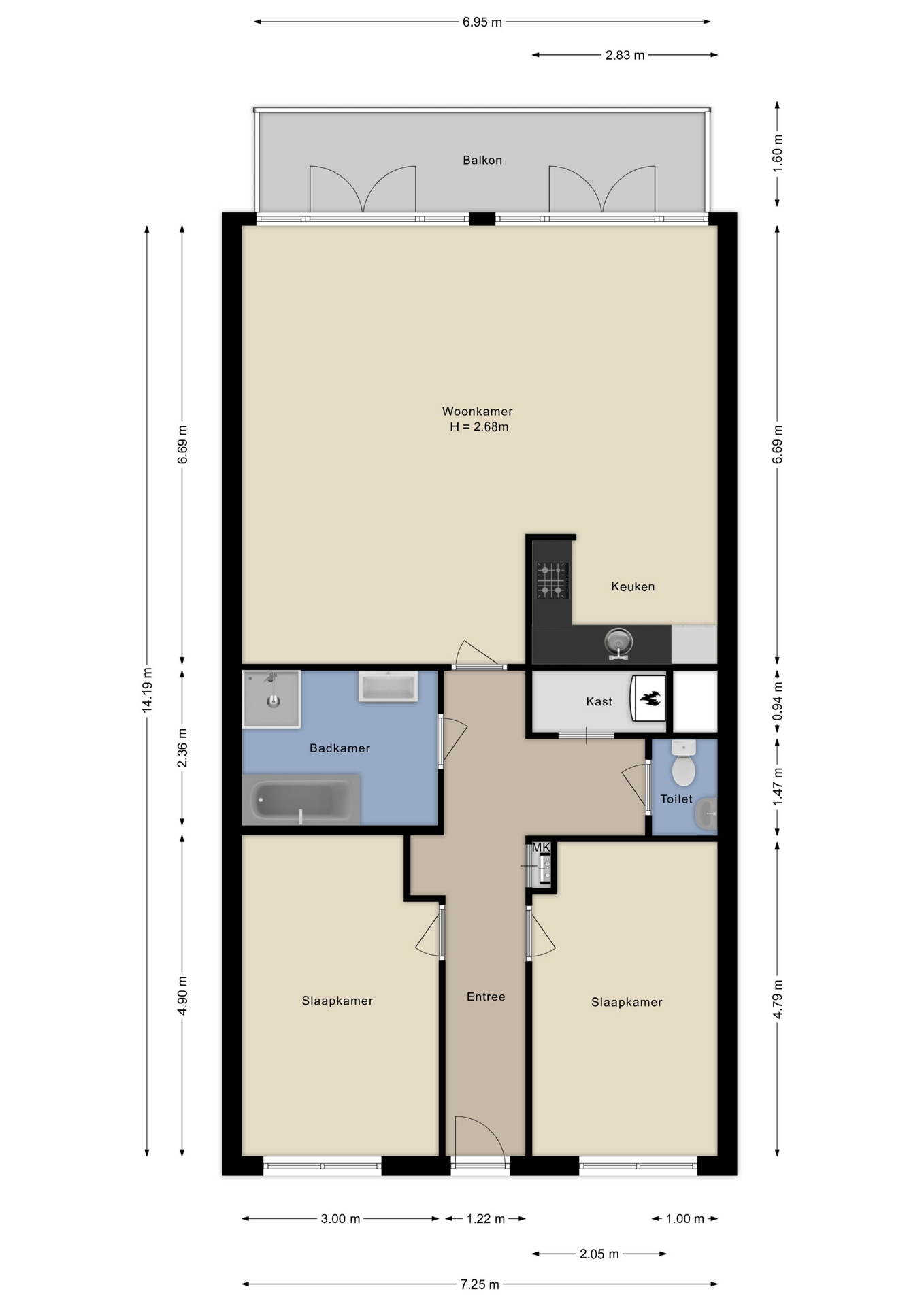 Entree, meterkast, toilet, video-intercom, hal vanwaar ieder vertrek te bereiken is. Er bevinden zich een tweetal slaapkamers in het appartement die allebei aan de galerij zijde zijn…