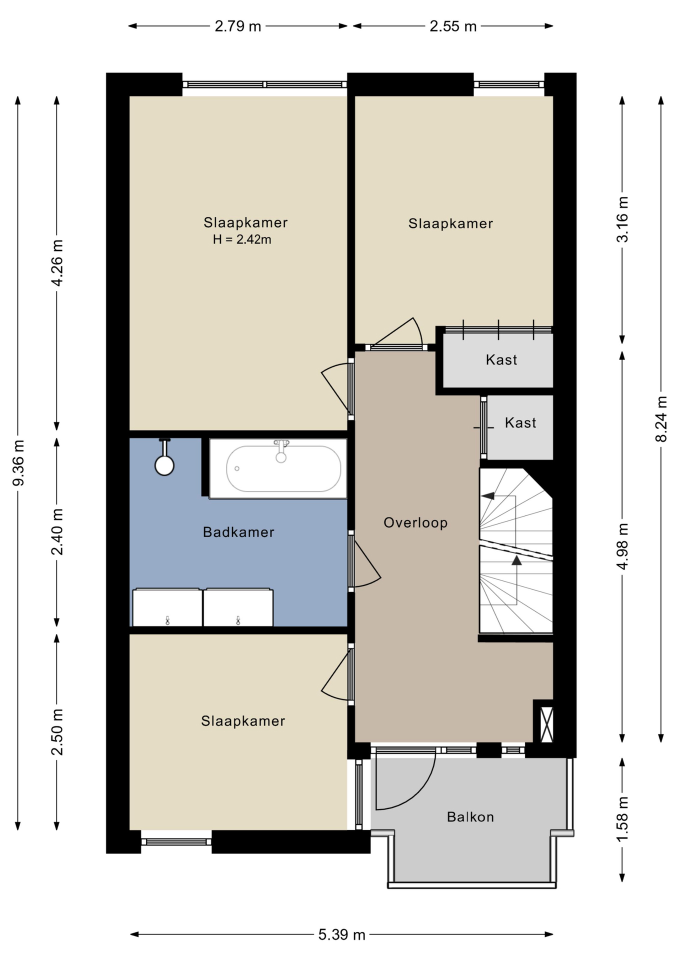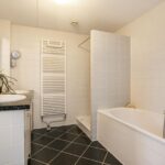 Laten we naar boven gaan. Op de royale overloop vind je een verrassend extra hoekje met toegang tot een overdekt balkon. Ook hier zorgt de goede lichtinval voor een prettige sfeer. De badkamer is efficiënt ingedeeld en biedt ruimte aan een aparte douche, een bad, een tweede toilet en een dubbele wastafel. Op deze verdieping bevinden zich ook drie slaapkamers.