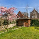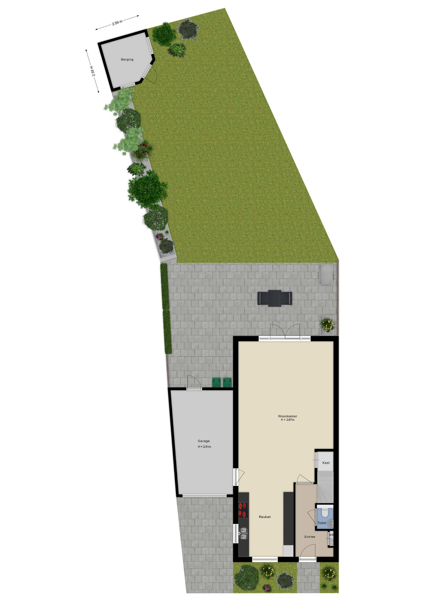 De tuin loopt van de voorzijde, langs de oprit (waar één auto kan parkeren), via de aangebouwde stenen garage naar de achtertuin, gelegen op het oosten. Vanaf de ochtend tot de middag, en ik de zomer tot in de avonduren kan je heerlijk genieten van de zon. De achtertuin is voorzien van gras en een terras aan de achtergevel. Het is een prachtig perceel om heerlijk te relaxen. Met de buren kan er in samenspraak nog een mooie schutting etc. worden gerealiseerd.