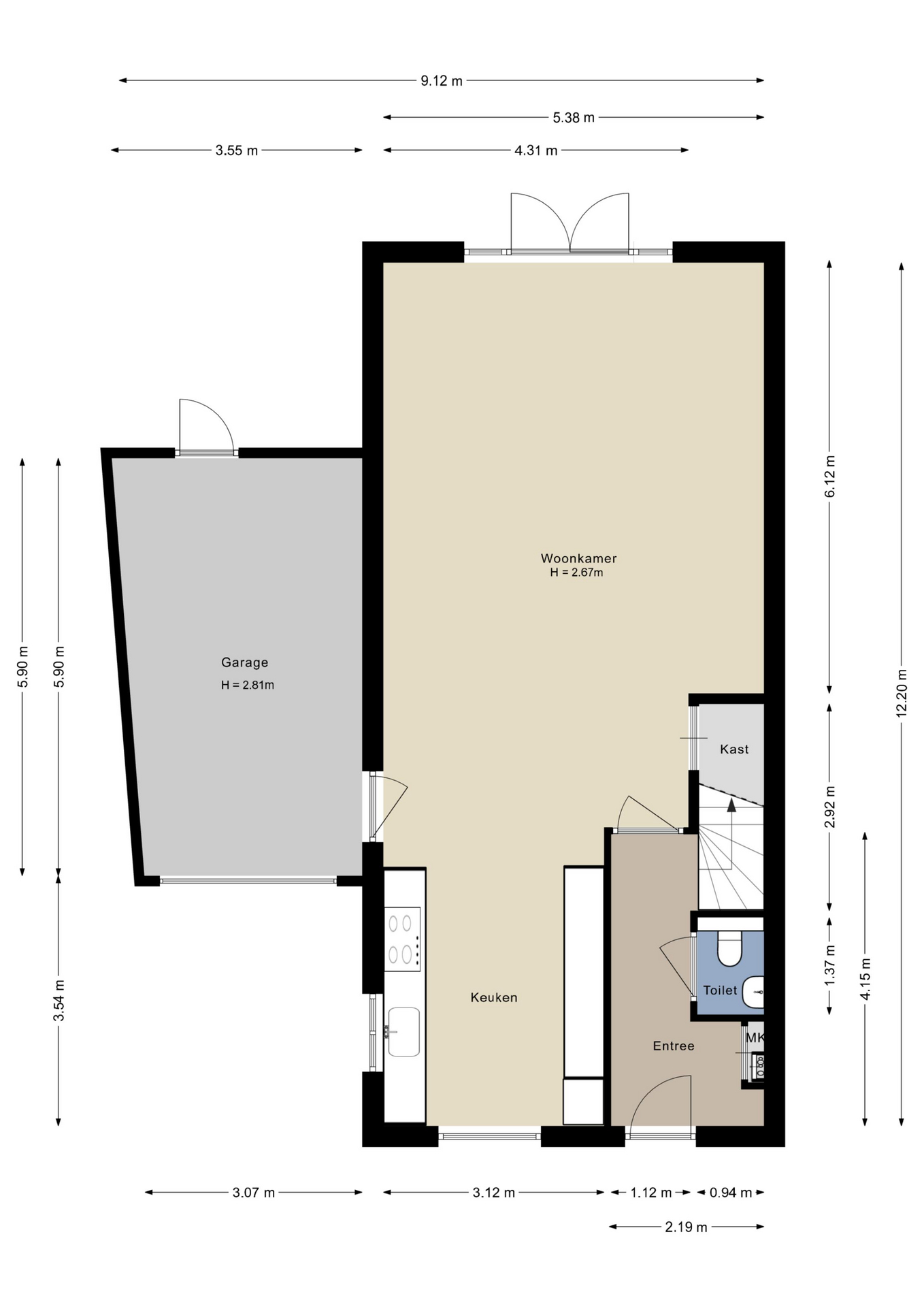 Ruime entree, toiletruimte met fonteintje, meterkast en toegang naar de ruime en lichte woonkamer. Aan de voorzijde van de woning is de open keuken gesitueerd. De keuken is voorzien van alle wenselijke inbouwapparatuur van AEG (oven, keramische kookplaat, vaatwasser en een koel-vriescombinatie). De lange eettafel staat in de keuken aan de voorzijde gesitueerd.