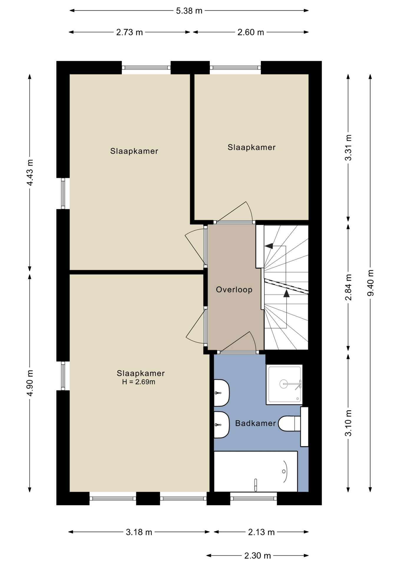 Overloop, toegang tot de drie (slaap)kamers en de badkamer. De grootste slaapkamer c.q. masterbedroom is aan de voorzijde gesitueerd.