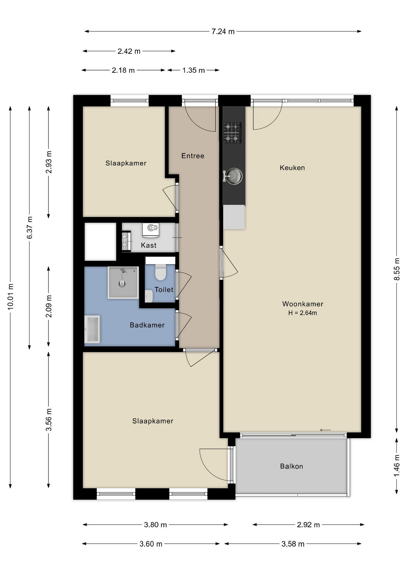 Binnenkomst in een ruime hal die toegang biedt tot alle vertrekken. De lichte woonkamer heeft grote raampartijen en opent via een harmonicadeur naar het balkon. Zo haal je op zonnige dagen het buitenleven naar binnen. De open keuken in rechte opstelling is compleet uitgerust met een 4-pits gaskookplaat, afzuigkap, koelkast met vriesvak, combi-magnetron en vaatwasser. Vanuit de keuken heb je tevens toegang tot de galerij. Dankzij de ruime indeling is er ook plek voor een royale eettafel. Er zijn twee slaapkamers, waarvan de grootste directe toegang heeft tot het balkon én is voorzien van Franse balkons. De badkamer is netjes en beschikt over een douche, wastafelmeubel en spiegelkast. Het toilet met fontein is apart gelegen. In de hal bevindt zich de inpandige berging met cv-ketel, meterkast en aansluiting voor de wasmachine.