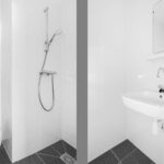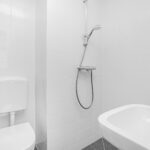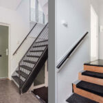 Via de speelse trap bereik je de tussenverdieping, waar de volledig betegelde badkamer is gesitueerd, voorzien van een douche, toilet en wastafel.