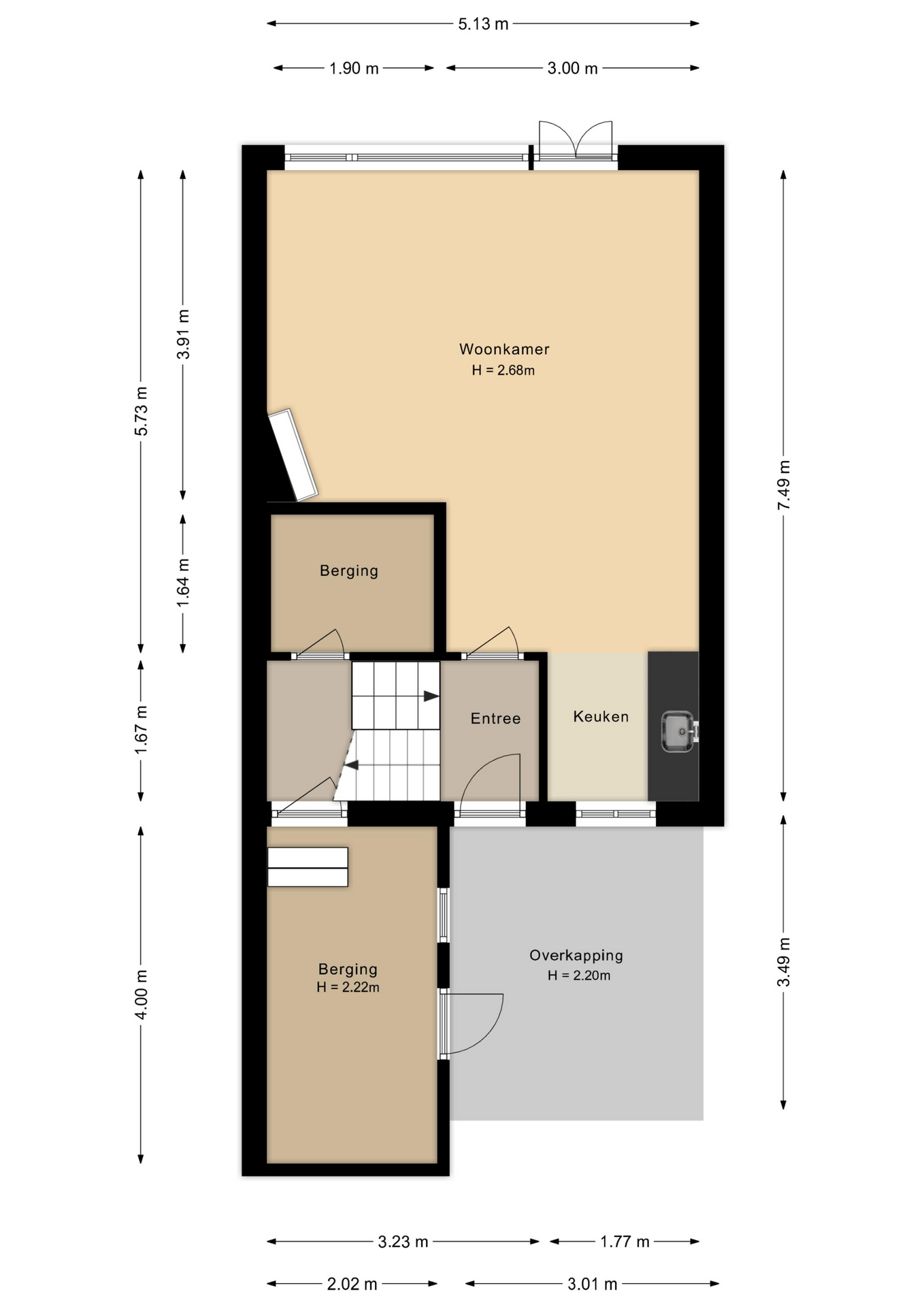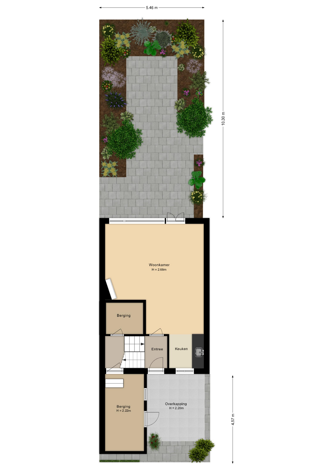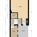 Via de voortuin met aangebouwde berging betreed je de woning. De entree leidt naar het speels ingedeelde trappenhuis, vanwaar je de woonkamer bereikt. De woonkamer is licht en ruim, met een hoog plafond, grote ramen en openslaande deuren naar de achtertuin. Hier is voldoende plek voor een comfortabele zithoek en een grote eettafel. De open keuken aan de voorzijde is momenteel eenvoudig ingericht in een driebloksopstelling, maar biedt volop mogelijkheden voor een persoonlijke inrichting. Vanuit de hal is er een trapje naar beneden naar een praktische bergruimte met wasmachineaansluiting. Ook de aangebouwde stenen berging is via deze ruimte bereikbaar en biedt ruimte voor fietsen en opslag. De meterkast bevindt zich eveneens hier.