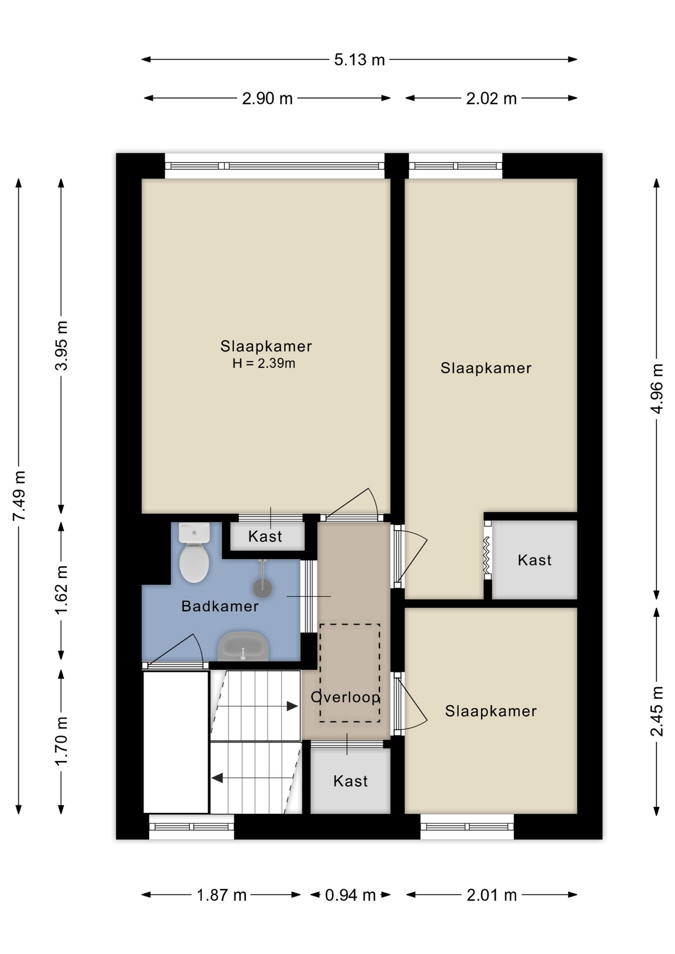 De overloop geeft toegang tot drie slaapkamers en een handige vaste kast. Aan de achterzijde liggen twee kamers, beide voorzien van een vaste kast. Aan de voorzijde bevindt zich de derde, kleinere slaapkamer.