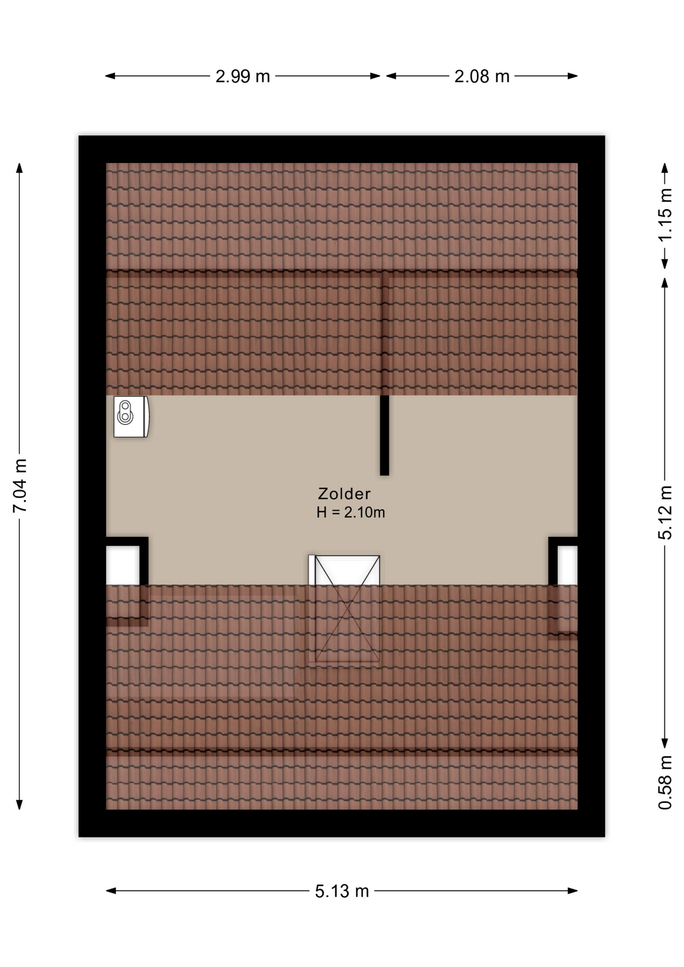 De zolder is bereikbaar via een vlizotrap of wandluik. Hier bevinden zich de cv-ketel, de omvormer van de zonnepanelen en de mechanische ventilatie-unit. De zolder biedt daarnaast veel extra opslagruimte.
