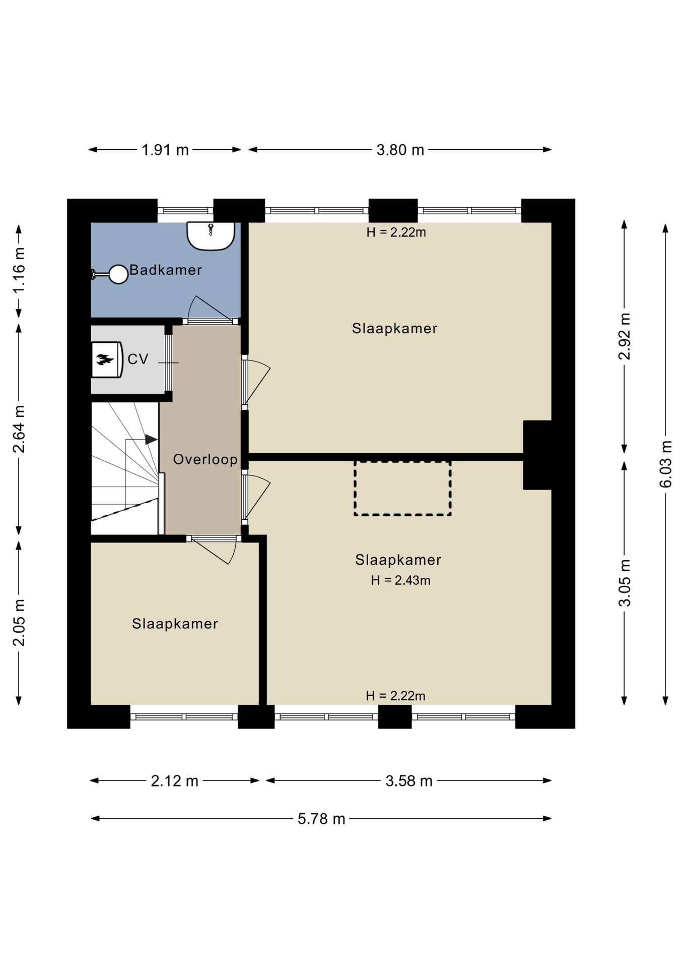 Op de eerste verdieping vind je drie slaapkamers. Twee van deze slaapkamers bevinden zich aan de voorzijde van de woning en de derde slaapkamer is aan de achterzijde te vinden, waar je extra opbergruimte hebt dankzij twee ingebouwde kasten. De ruime slaapkamer aan de voorzijde heeft ook een vaste kast en biedt toegang tot een vliering die als bergzolder kan dienen. De badkamer is geheel betegeld en voorzien van een douche en wastafel. Op de overloop vind je verder een vaste kast met de opstelling van de cv-ketel.