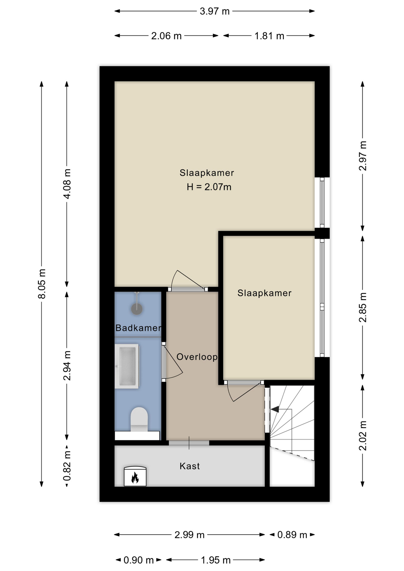 Via de overloop zijn een tweetal goed bemeten slaapkamers te bereiken, alsmede de stookruimte en de moderne badkamer met douche, wastafel en toilet.